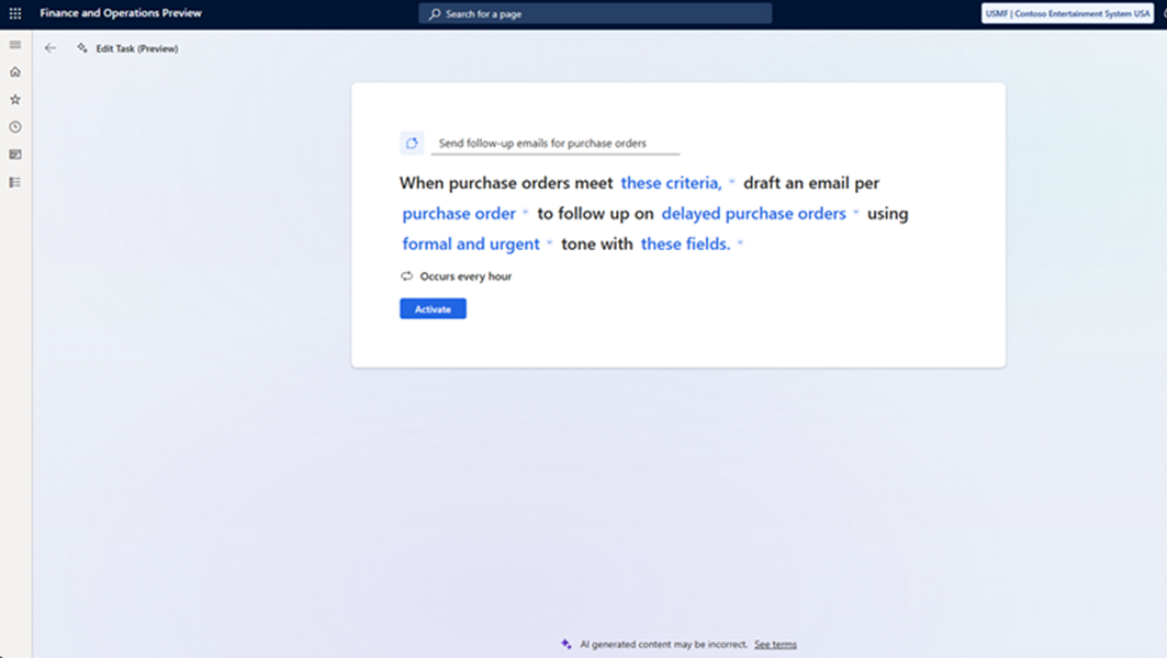 Agentin voi valjastaa lähettämään toimittajille muistutuksia vahvistamattomista ostotilauksista sekä tiedusteluja myöhässä olevista ostotilauksista. Käyttäjä määrittää Microsoft Dynamics 365 SCM -järjestelmässä ehdot, joiden mukaan muistutukset generoidaan, sekä sävyn, jolla muistutusviesti tulisi luoda. Varsinaisen sähköpostin sisällön ohjeistus määritetään agentille Copilot Studiossa.