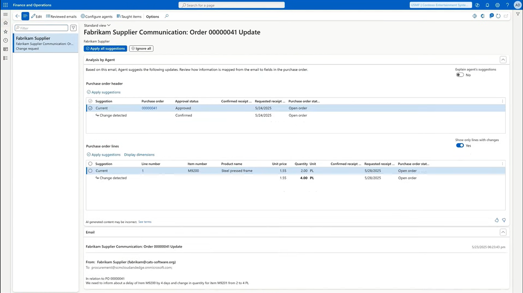 Tällä hetkellä agentti pystyy lukemaan vain liitteitä, jotka ovat pdf-muodossa. Alkuperäinen sähköpostiviesti ja sen liite näytetään käyttäjälle Microsoft Dynamics 365 SCM -järjestelmässä. Kun käyttäjä on käynyt läpi agentin havaitsemat ehdotukset ja tehnyt tarvittavat muutokset, käyttäjä vahvistaa muutokset ostotilaukselle.